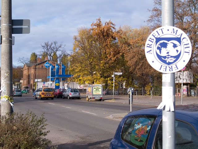 The phrase "Arbeit macht frei" (work will set you free), cruel slogan that was placed at the entrances of many Nazi concentration camps, is decontextualized and integrated into existing economic structures by the ownership of the logo of the IMF (International Monetary Fund ).